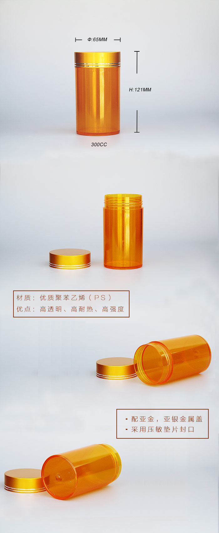 300ccPS高透塑料瓶容(róng)量:300cc。