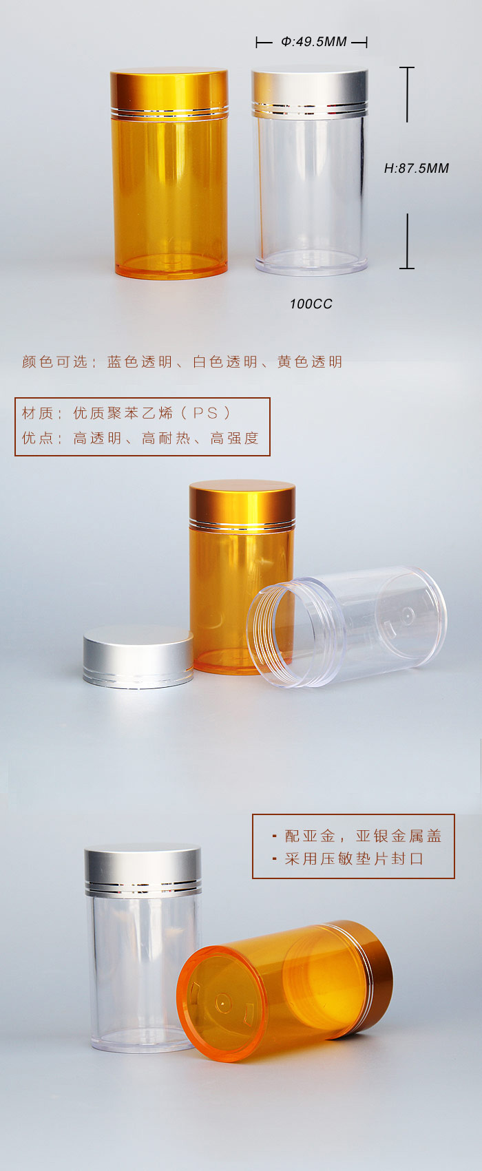 100ccPS高透塑(sù)料瓶容量(liang):100cc。